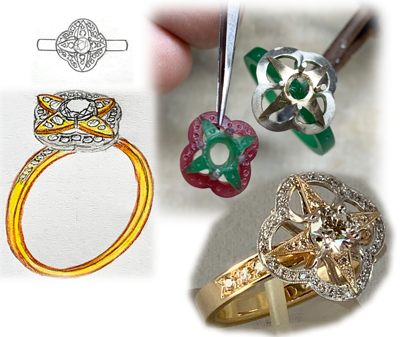 I can work with your ideas and provide any stones, gold, platinum, or silver needed.